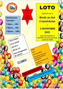 Le club de pétanque La Boule au But Craywickoise organise son loto le dimanche 2 novembre 2025 à la salle Albert Costenoble.